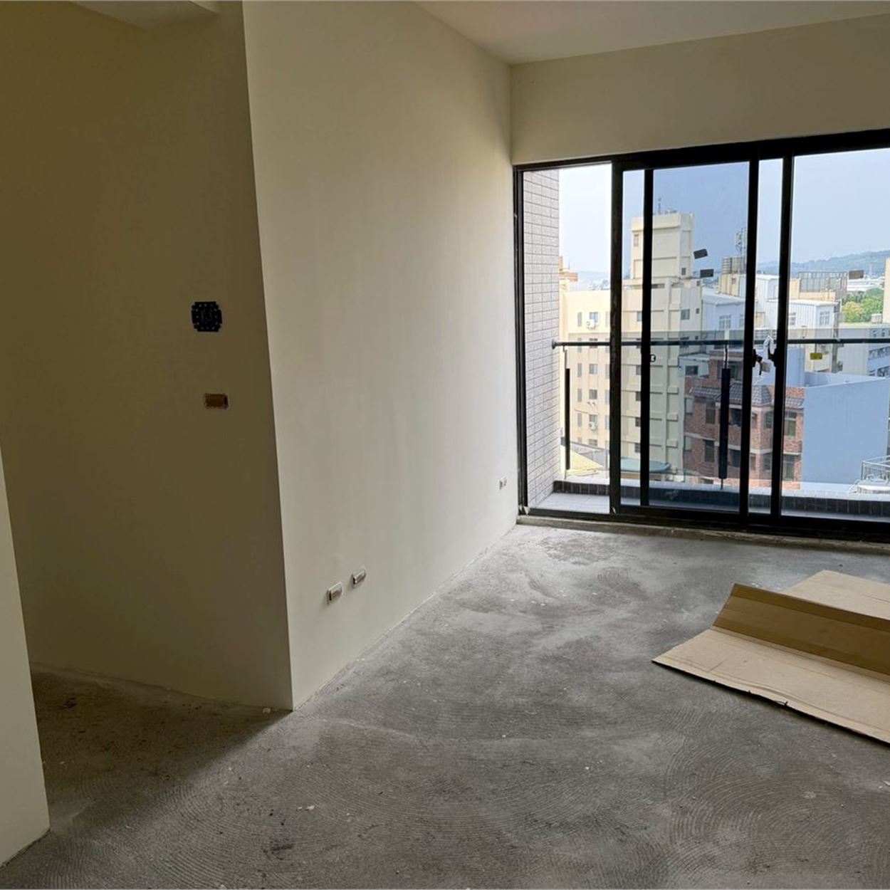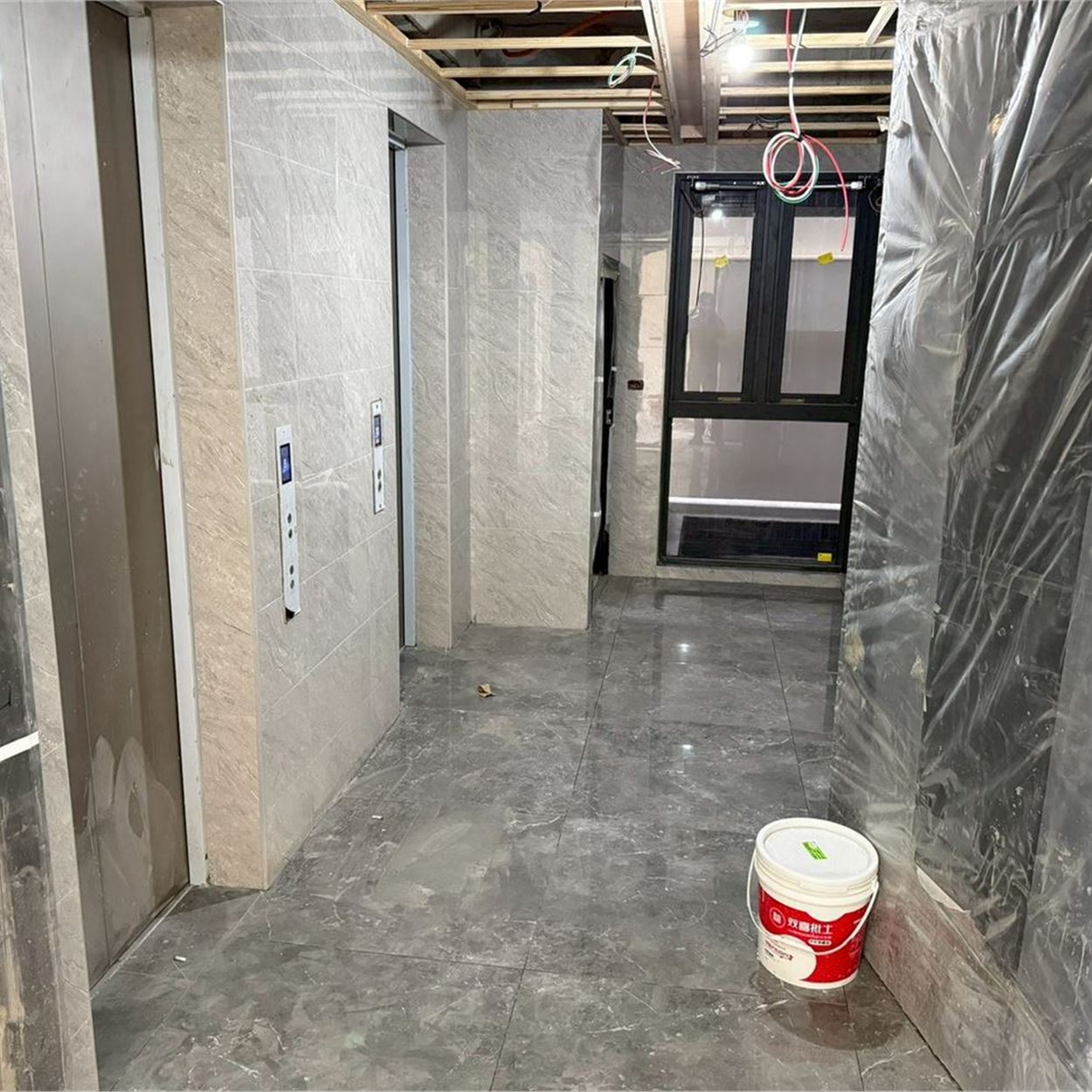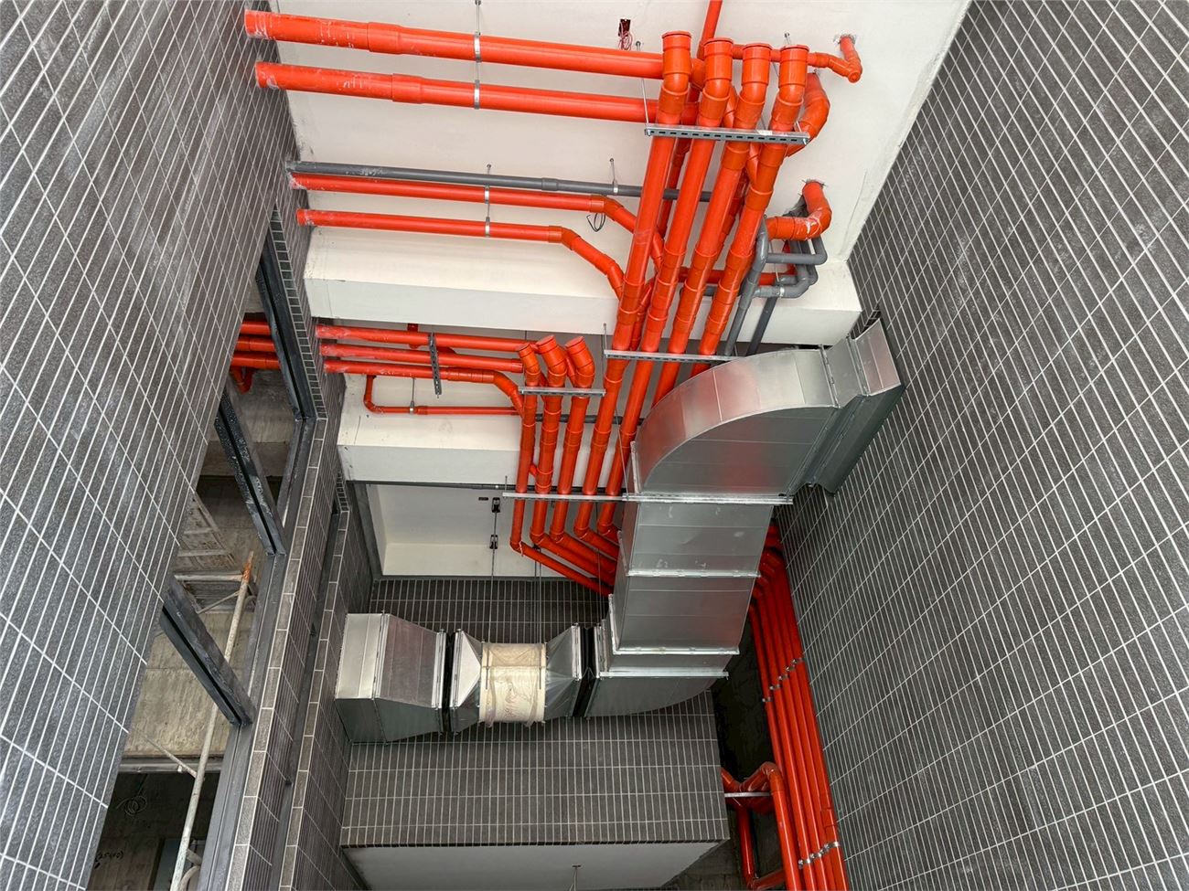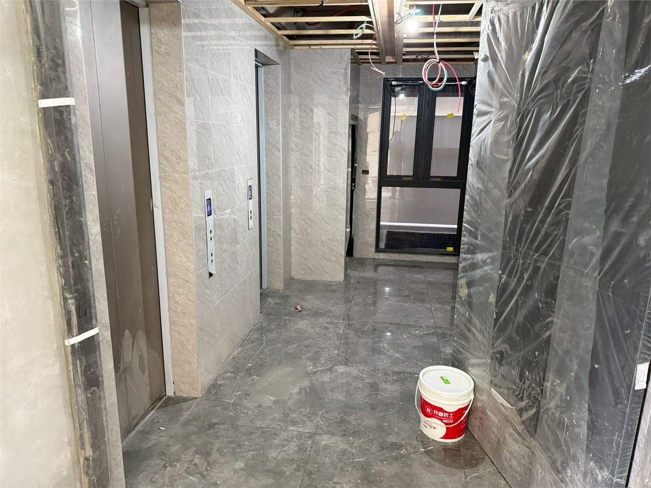 梯廳地磚施作.壁磚完成;露台地磚完成;浴廁安裝完成;落地窗、三合一門玻璃安裝完成;木門框安裝完成;污排水管.進排風完成