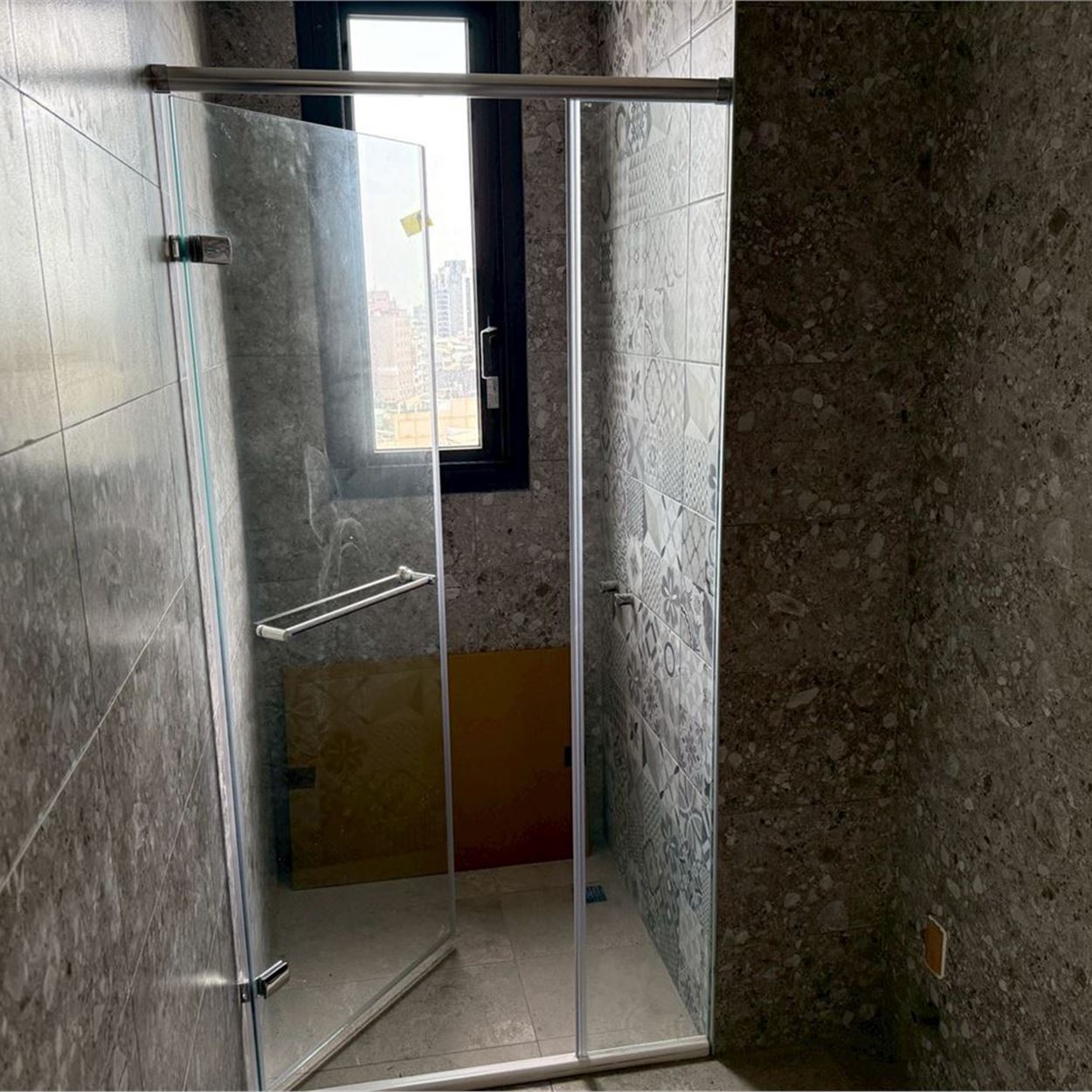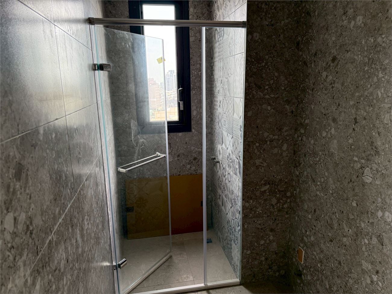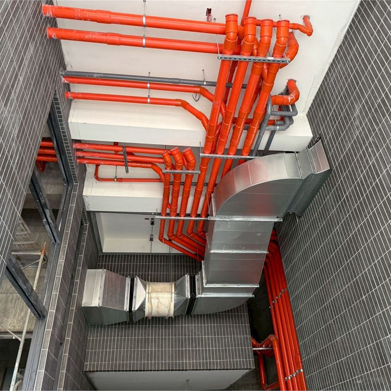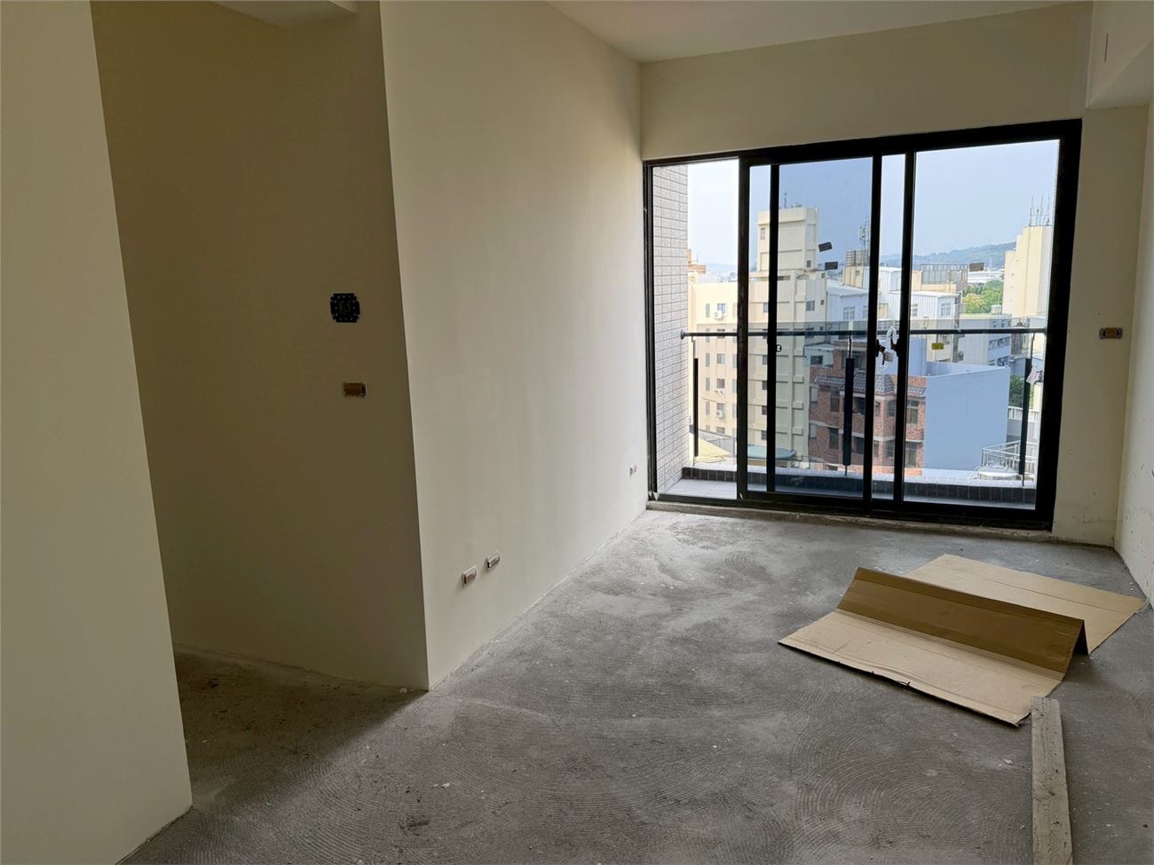 梯廳地磚施作.壁磚完成;露台地磚完成;浴廁安裝完成;落地窗、三合一門玻璃安裝完成;木門框安裝完成;污排水管.進排風完成