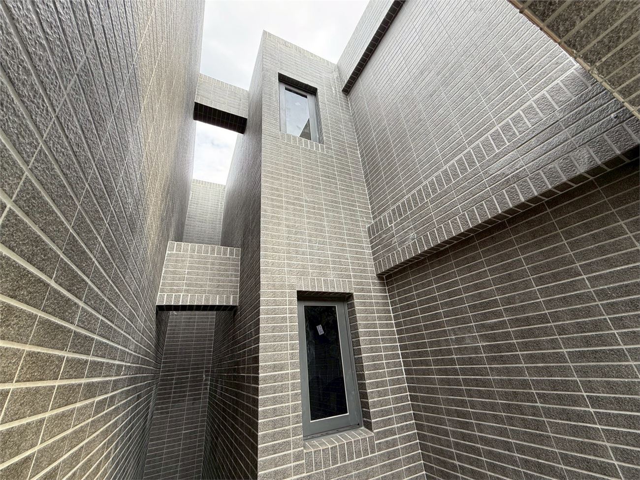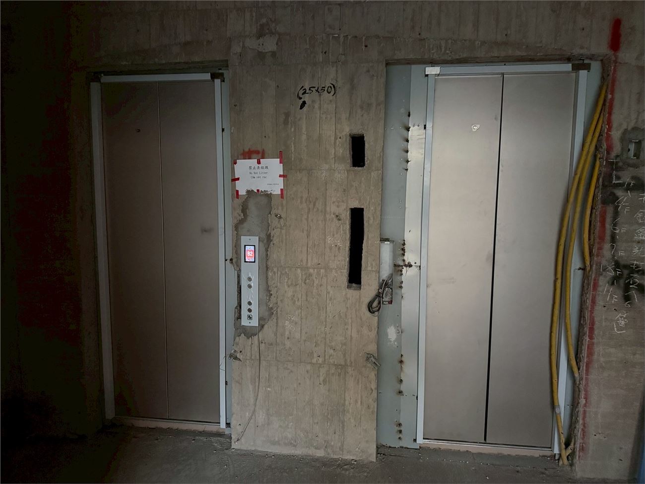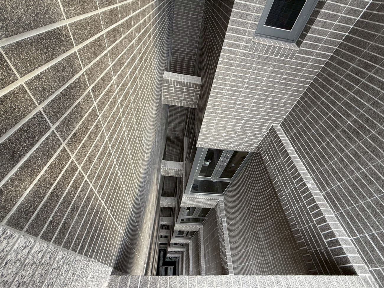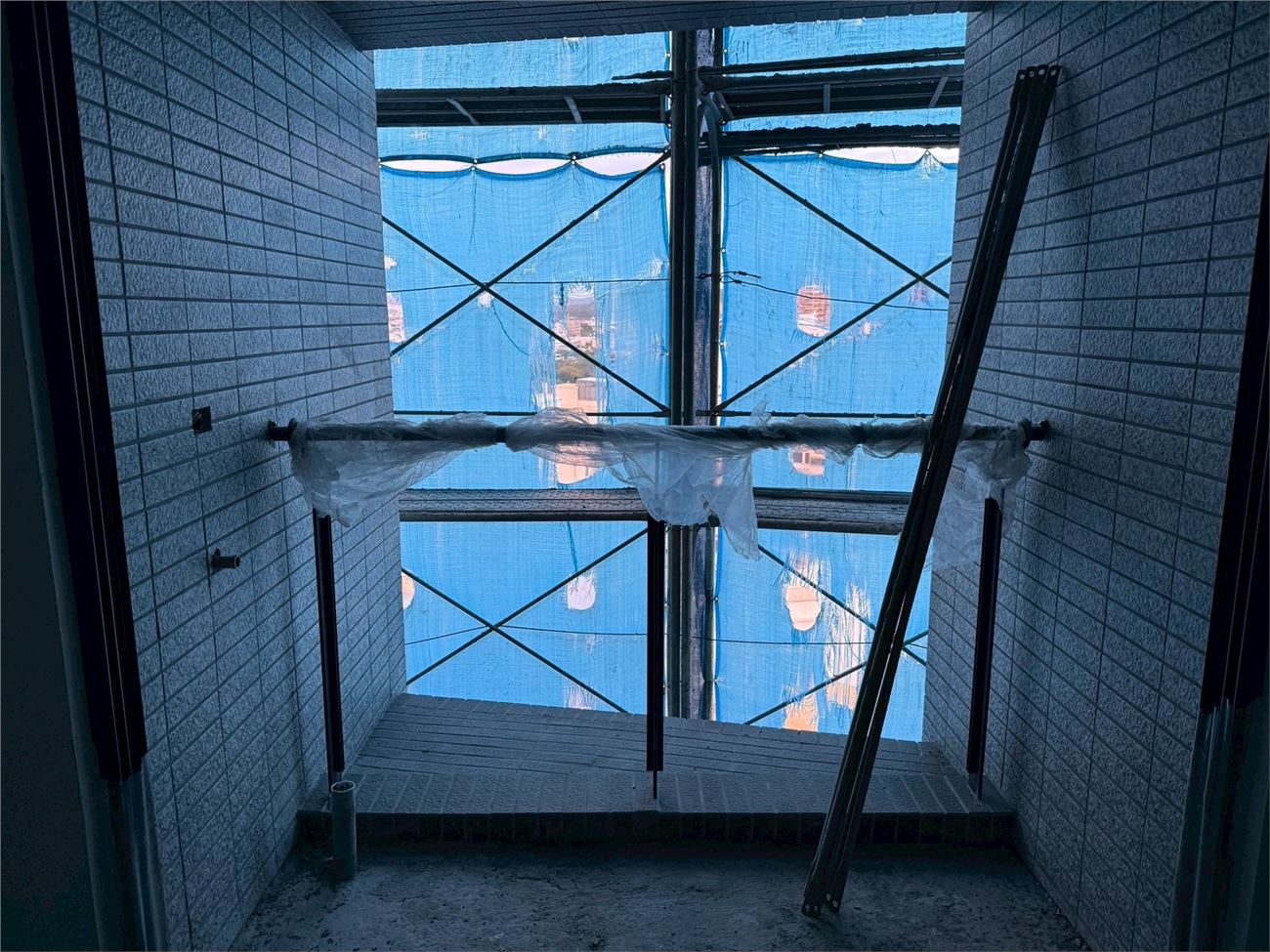 屋頂地磚施作完成;窗框玻璃安裝中;玻璃欄杆施作完成;室內輕隔間灌漿完成;隔間油漆施作中;浴廁防水施作中;無障礙電梯試車、 一般電梯施作。